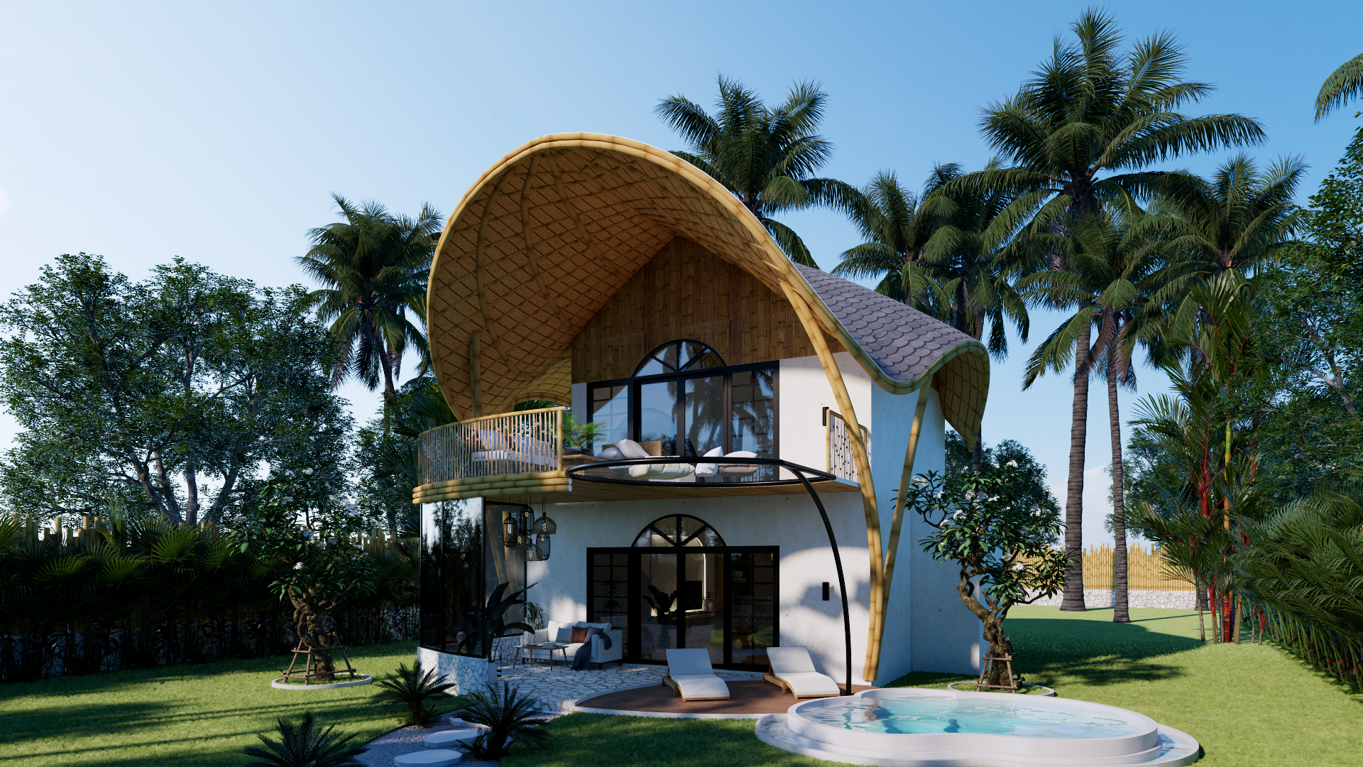 De bamboe constructie en het Ulin dak zorgen voor een serene, organische uitstraling, terwijl de doordachte indeling deze villa ideaal maakt voor vrienden of families die samen reizen.
