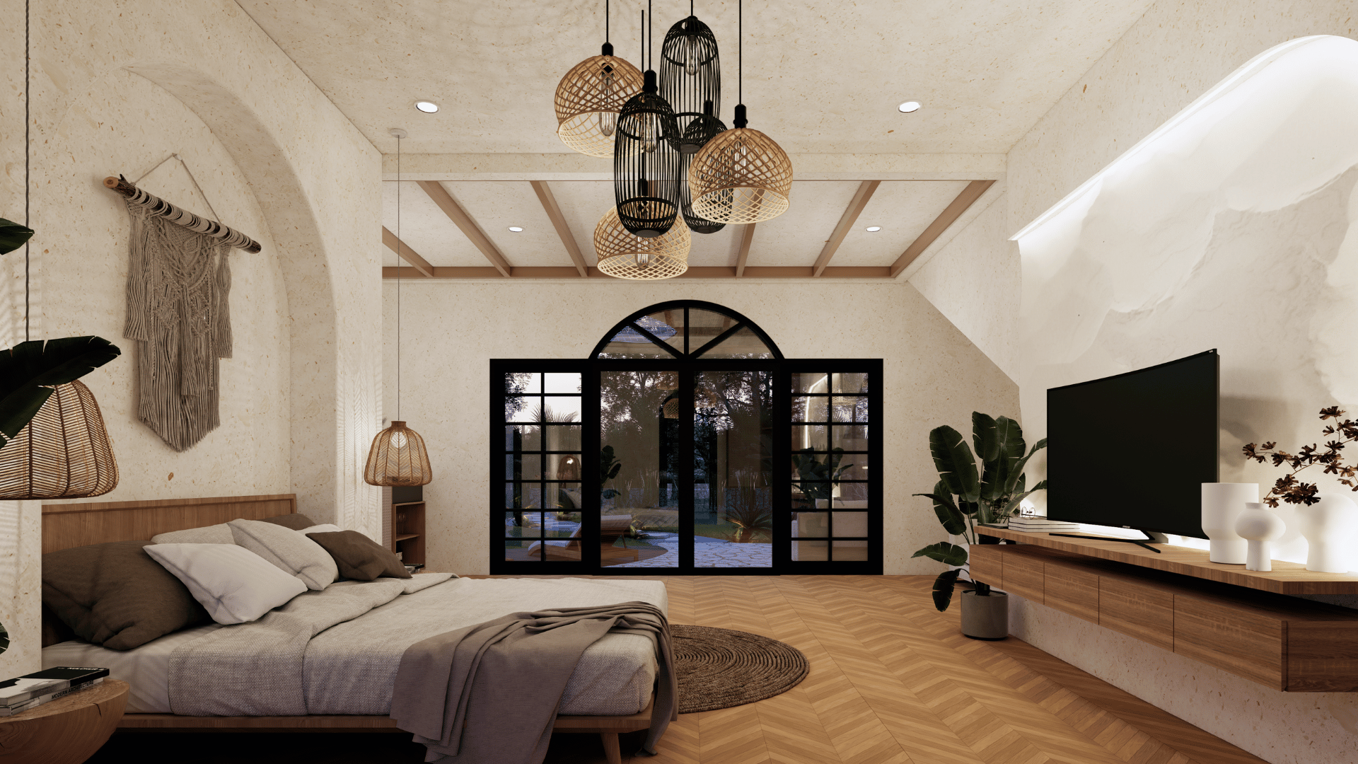 The 2-Bedroom Villa spans two levels and features an organically shaped bamboo structure topped with a Ulin roof. The high vaulted form, natural finishes, and large glass doors create a bright, elegant, and serene atmosphere. The villa includes a fully equipped kitchen, two spacious bedroom: each with its own private bathroom, private terraces, and a balcony with a hammock net, perfect for relaxation.